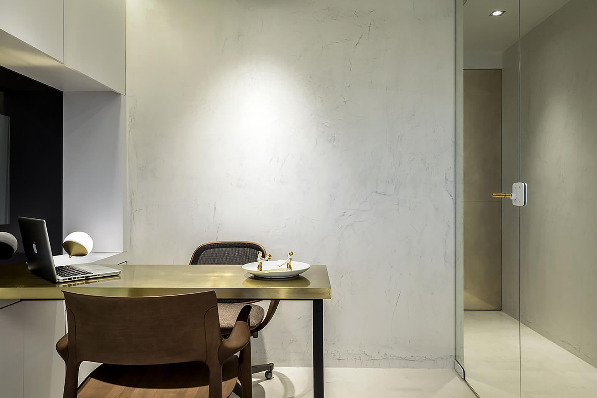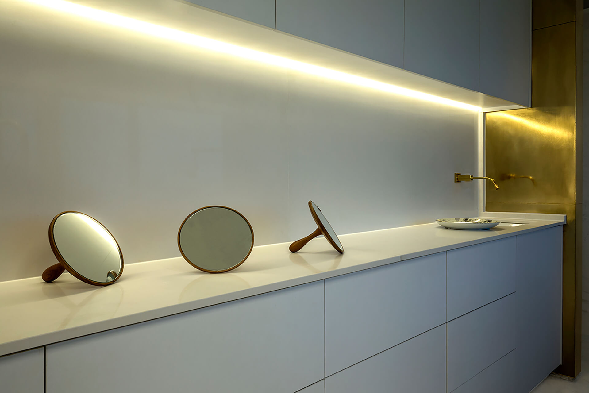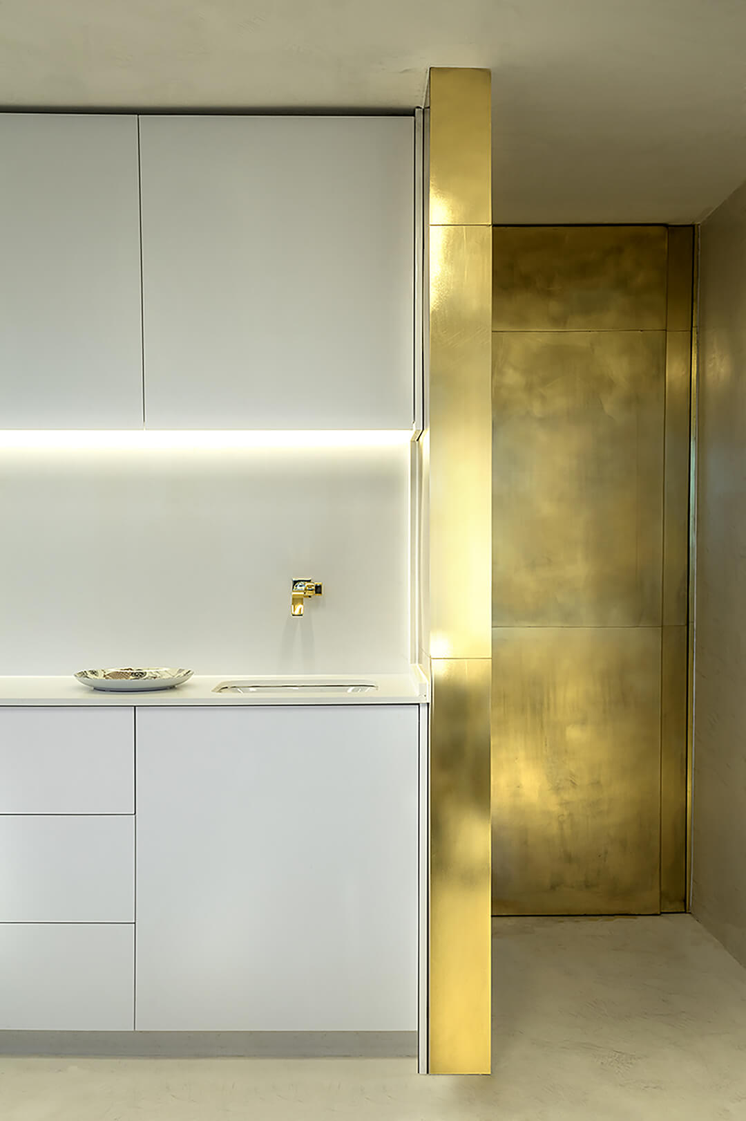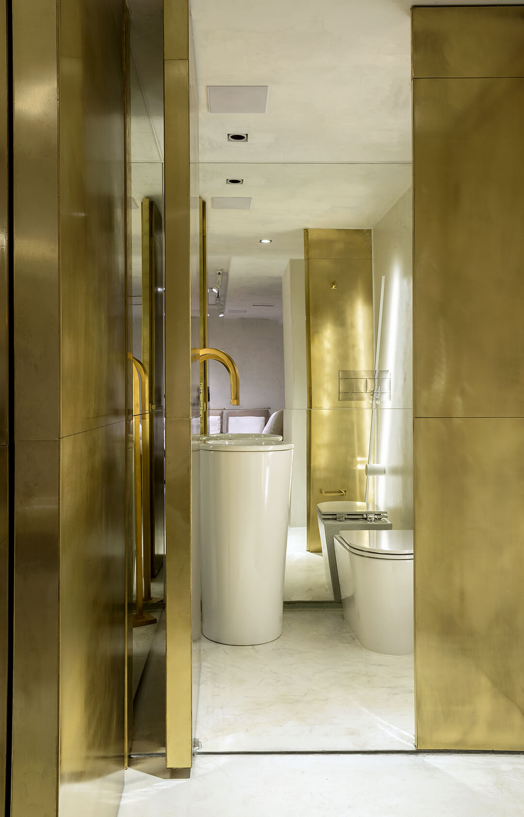 This is a design choice we’ve seen before from the likes of Studio Karhard and Masquespacio – we’re beginning to think the dentist’s office is the new café in terms of casual Instagrammability. But instead of the maximalist hue-and-saturation approach in those projects, Um a Um went for a minimalist spin on traditional elegance. ‘That’s because the meaning of beauty is relative, and to us beauty is related to the quality of a material – thus, gold,’ Um a Um’s Lilian Glayna said. That explains the strategic use of metal and concrete in the reception lounge and the small lavatory.