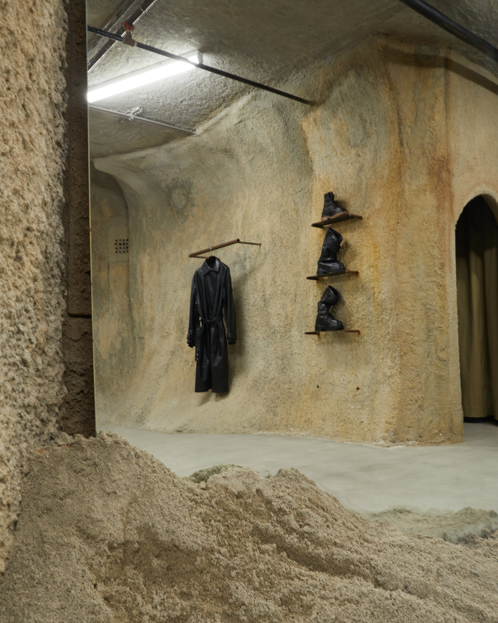 Known for its experimental and playful approaches, multidisciplinary studio Zoo as Zoo designed the cavernous, grotto-like setting to push the boundaries of traditional retail. Treading delicately the balance of mixing extreme polars, the experiential exercise evokes strong emotions without foregoing utilities. Inventory storages are carefully tucked in an accessible hallway lining behind the hand-formed stucco walls. Measured and modular shelving systems integrates within the space in a single gesture, and custom-made rack systems emerges as deliberate, purposeful sculptural focal points. The space embodies sentiments of uncanny familiarity, encourages curiosity and discovery in visitors, as it steers away from conventions of an aesthetically pleasing and architecturally sound retail space. Here, a harmonious convergence of disparate elements forms to disrupt quietly.