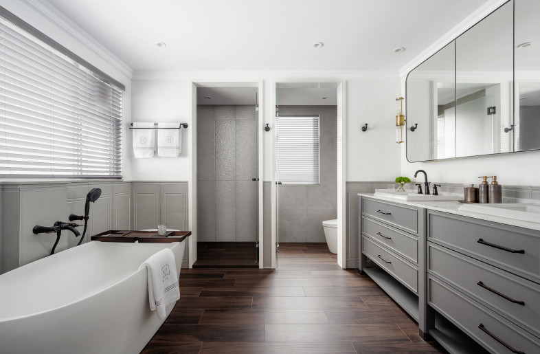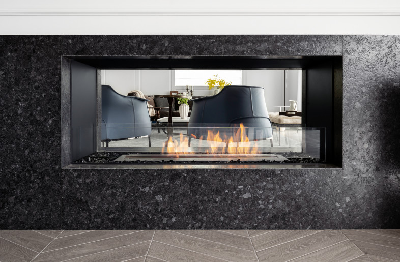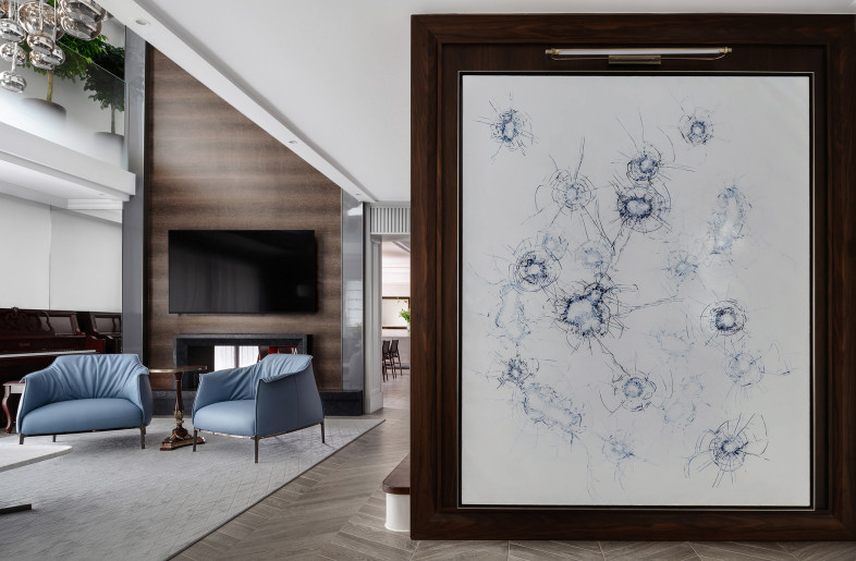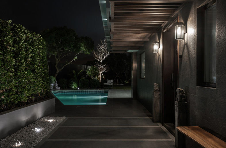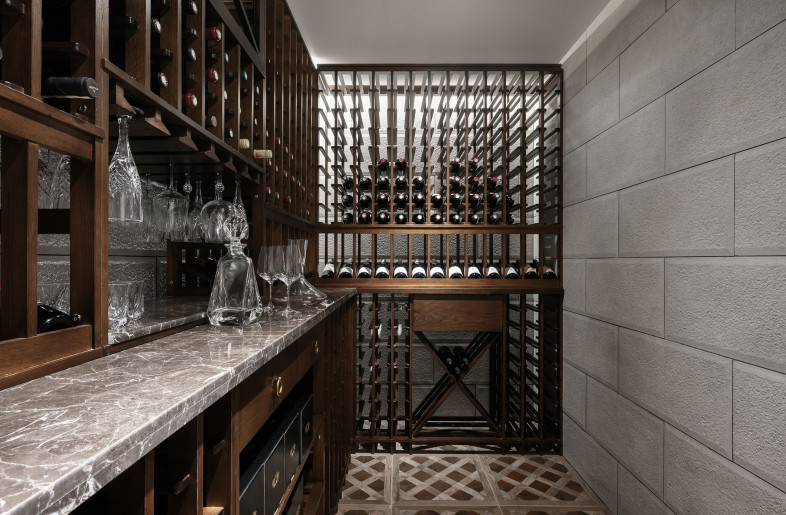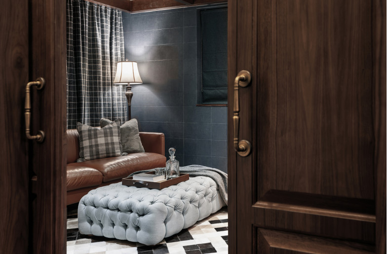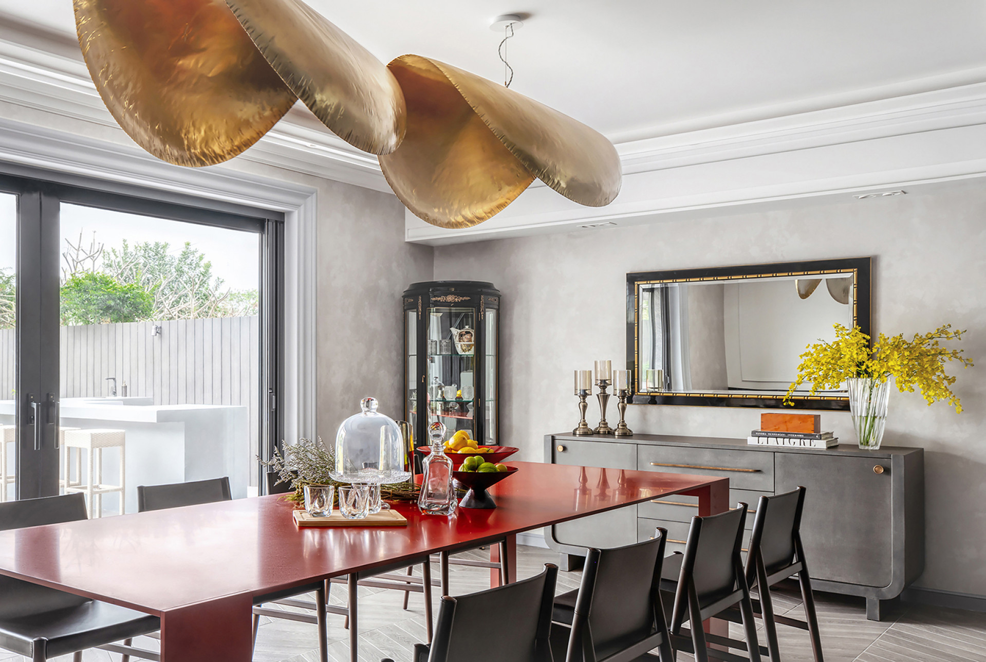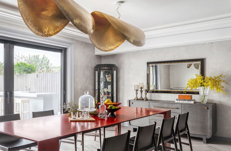 Often known that Hong Kong full of hustle and bustle, creating a tranquil escape journey for this new renovation home is essential. Truly want our client to wind down and turn off in our design. A modern colonial style would be introduced to this young couple family in which grows up in American. Dividing this 4000 square feet house into different chambers to accommodate owner’s various lifestyle such as open kitchen bar area for cook sharing, wine cellar for daily wine tasting, two study rooms for owner’s work from home. Walking through a secret pathway with grey gradation granite palette pavement, layering of plants guiding to the house. To increase the sense of openness to nature, a double void area of living room is created, so that extra natural light can get into the house. Using fireplace as focal point to linkage both living and dining chamber. Layered tone of classic gray silhouette wall used as the perfect backdrop to juxtapose with understated walnut finishes. Contemporary furniture blends with some antique pieces to bring a touch of colonist style. Besides, designer want to have slight portions of popup hue to differentiate different chambers .A valiant wine red metal dining table paired up with gold leaf –shaped pendants to furnish an uncommon dining experience. An Oliver green lacquer bookshelves with fireplace are used in master study room as a bold colonial statement. For master area, white beige color and textural wallpaper are used to soften bedroom to provide a tranquil elegance for resting.