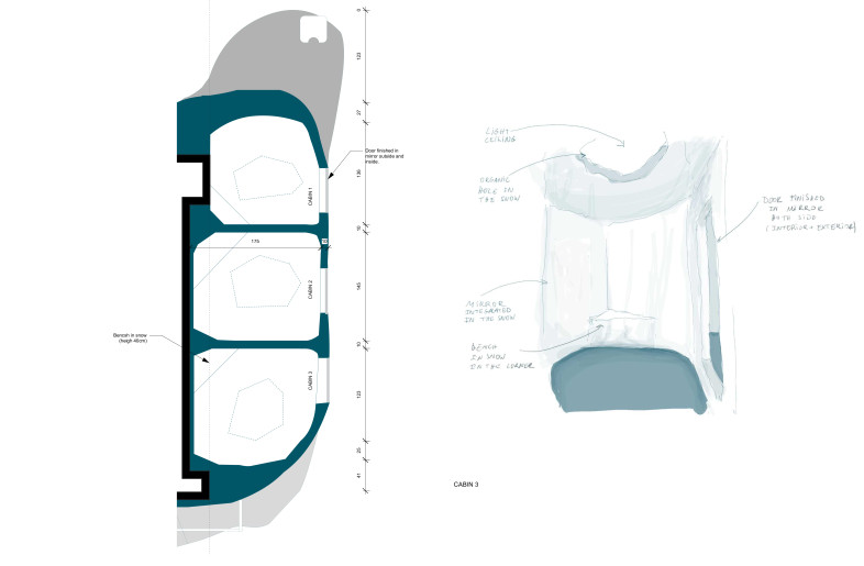 Special attention was given to the selection of materials, lighting, and color palette in order to evoke the cold, luminous atmosphere of glaciers. A focused material study led to the development of a unique plaster finish that mimics the texture of natural snow. The main challenge lay in recreating the visual and tactile qualities of snow — its shimmer, sparkle, and powdery surface. An innovative solution was developed: a coating composed of glass microbeads applied over a white base, delicately reproducing the brilliance and subtlety of fresh snow.
